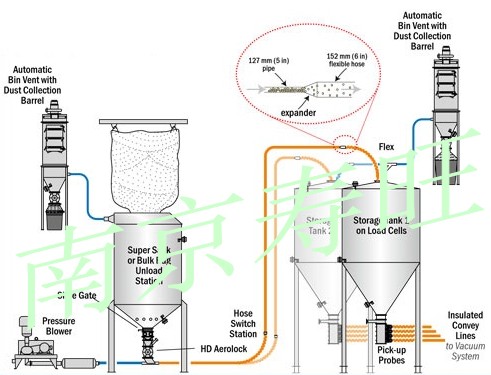 在進(jìn)料閥的控制下物料從料斗進(jìn)入發(fā)送器。物料在空壓機(jī)產(chǎn)生的高壓氣體的壓力下,料氣混合后,以一定的流速,經(jīng)管道送到終點(diǎn)的料氣分離設(shè)備,分離出物料進(jìn)入料倉,氣體排入大氣。